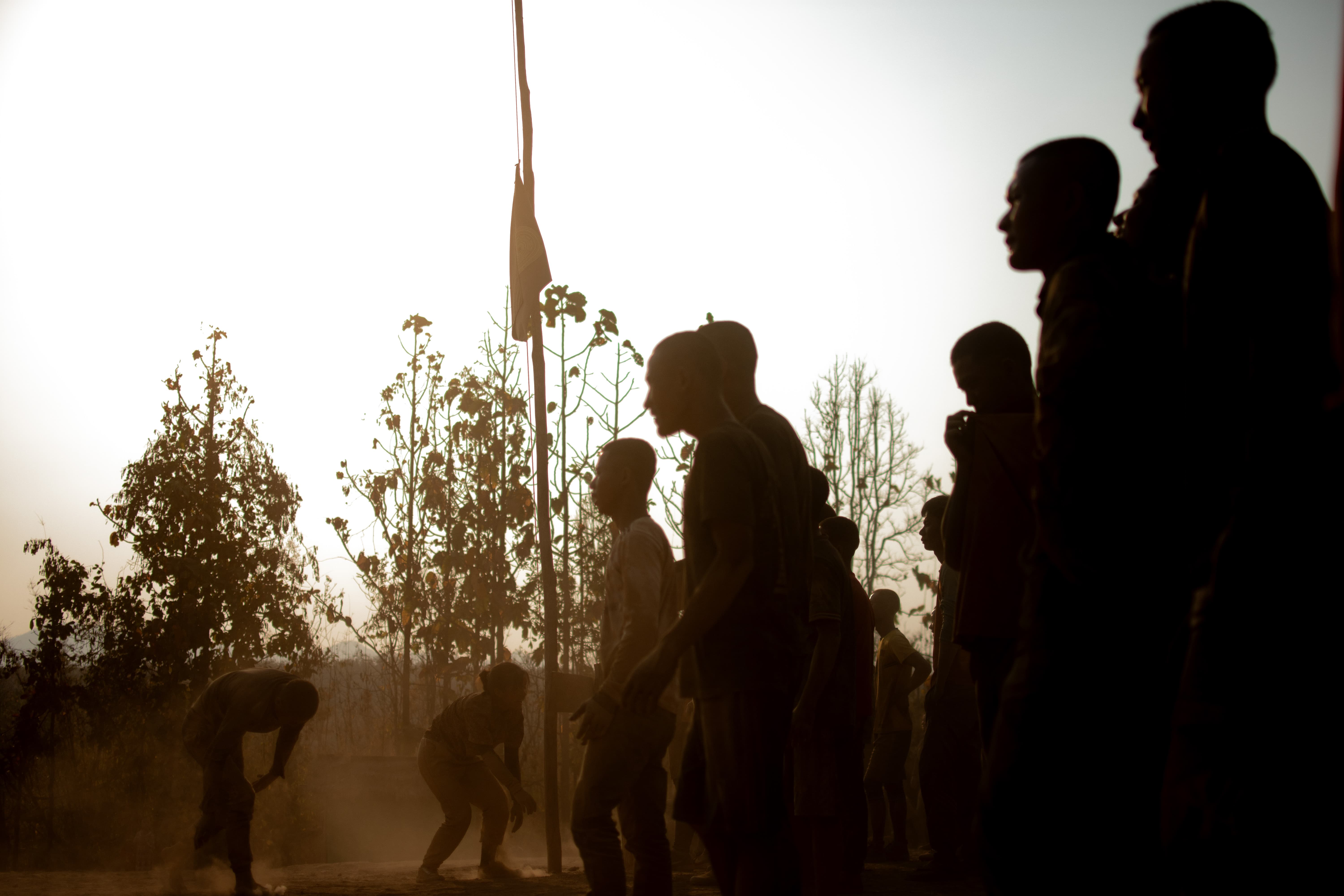 New recruits of KNDF taking basic training beneath half-mast flag, honouring comrades fallen on the day, March 2024.